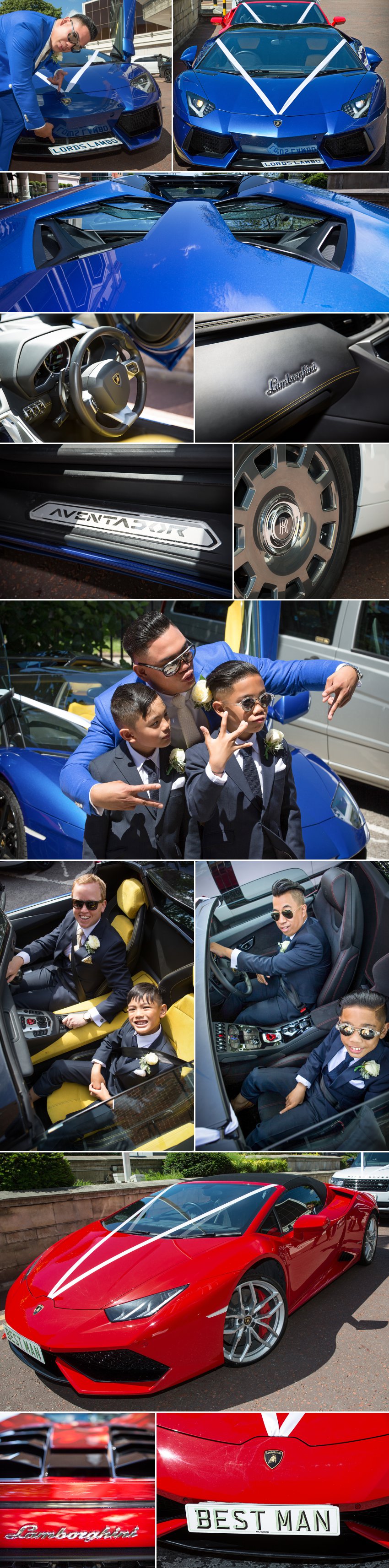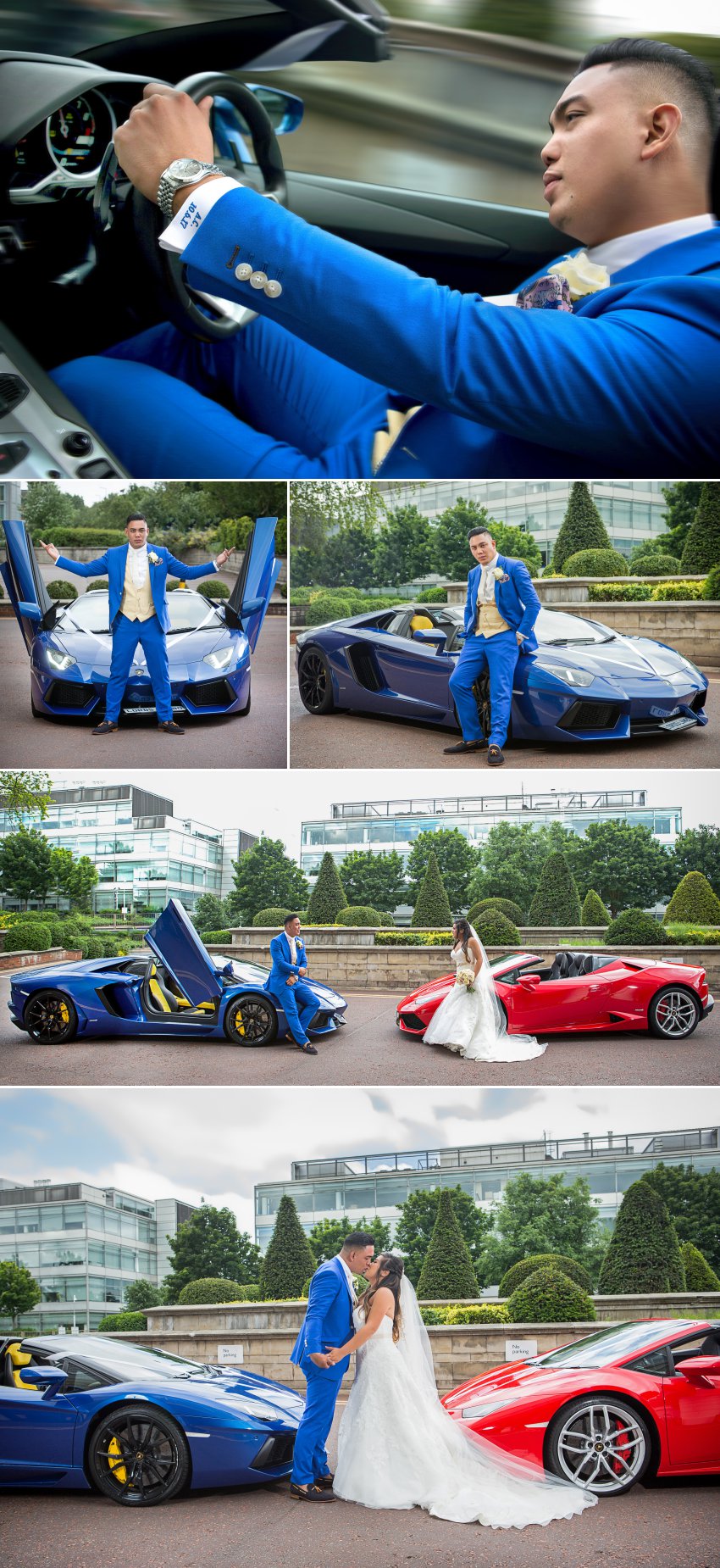 Once the wedding was finished, and we had taken some great group family shots as well as some more of the happy couple walking out of the church into a shower of petal confetti, it was time for everyone to make their way to the reception venue. Alvin swapped his sports car for the regal elegance of the Rolls Royce Phantom that had conveyed the bride to the church. We made use of the sports cars once we got to the hotel – any excuse to take a few more shots of these beautiful vehicles! The personalised number plates Alvin had arranged for all three cars were a cute touch.