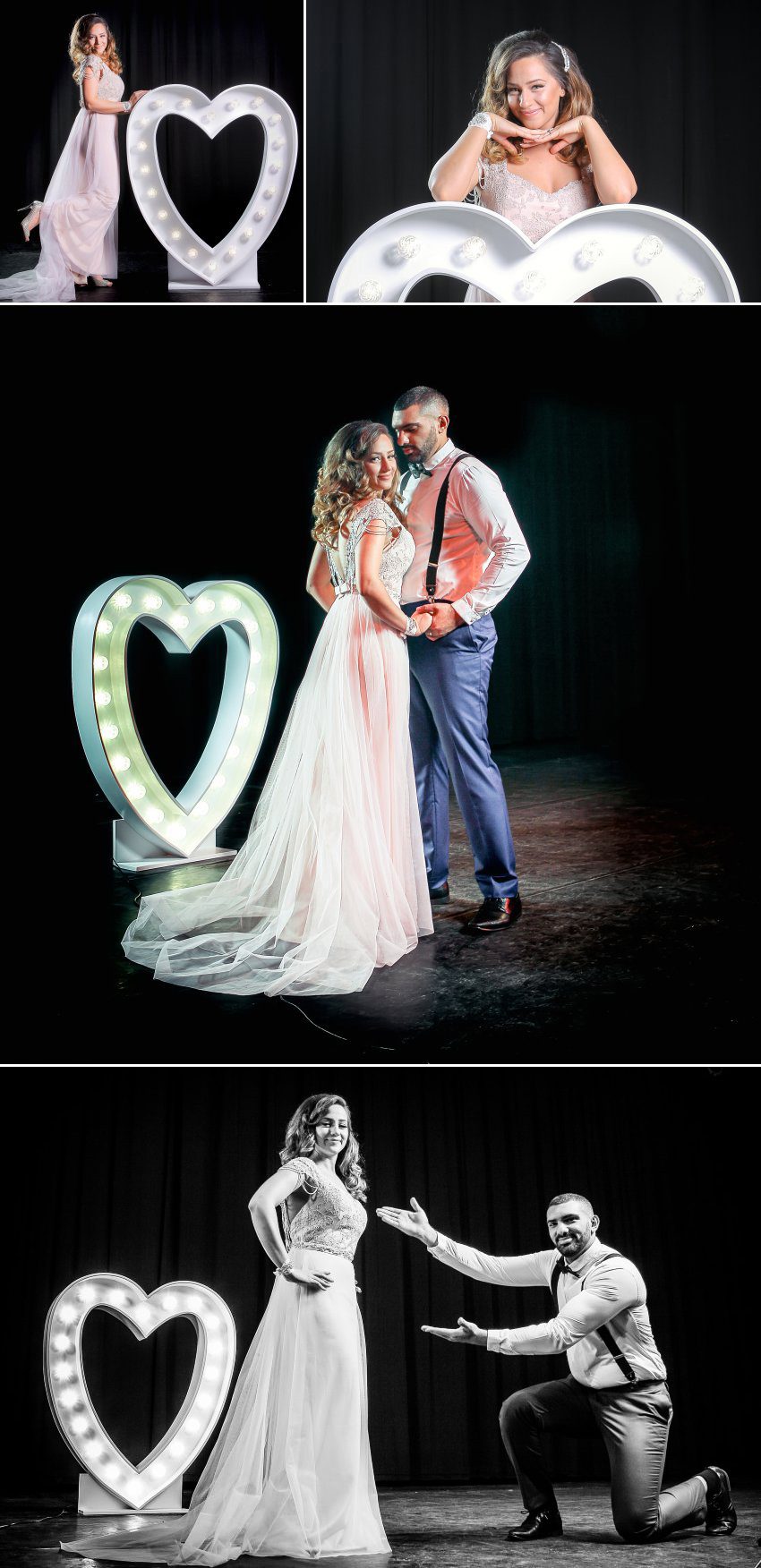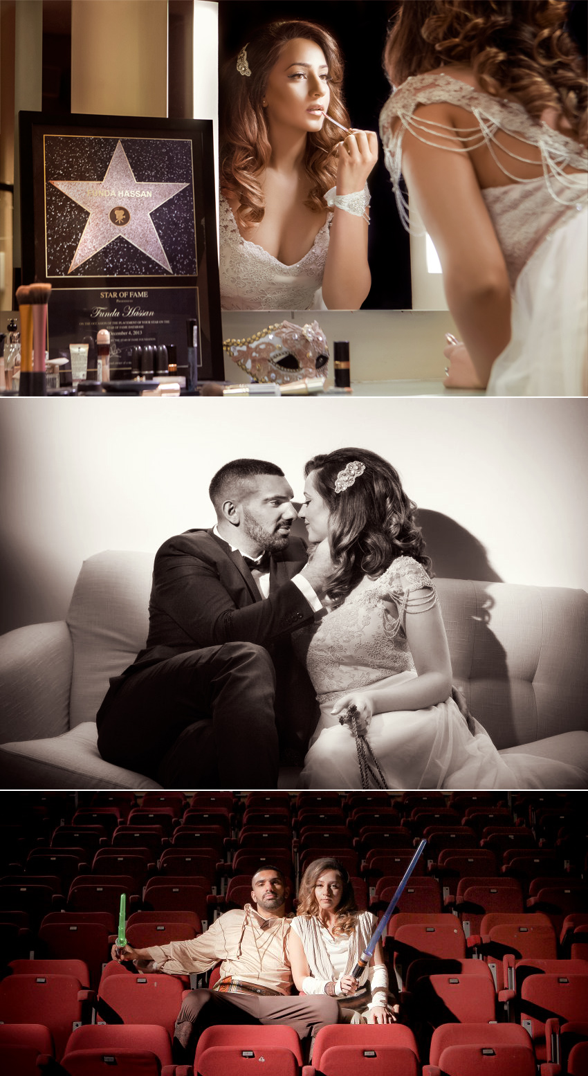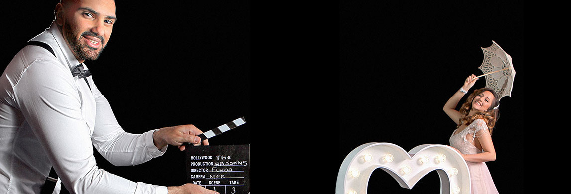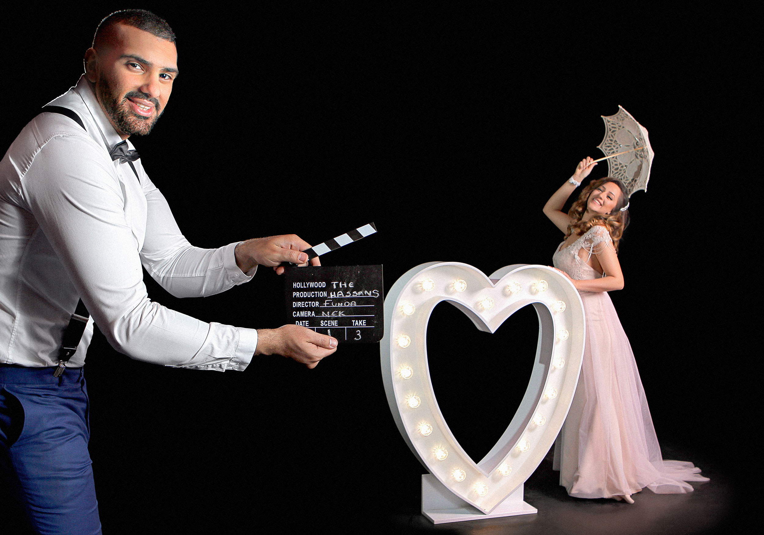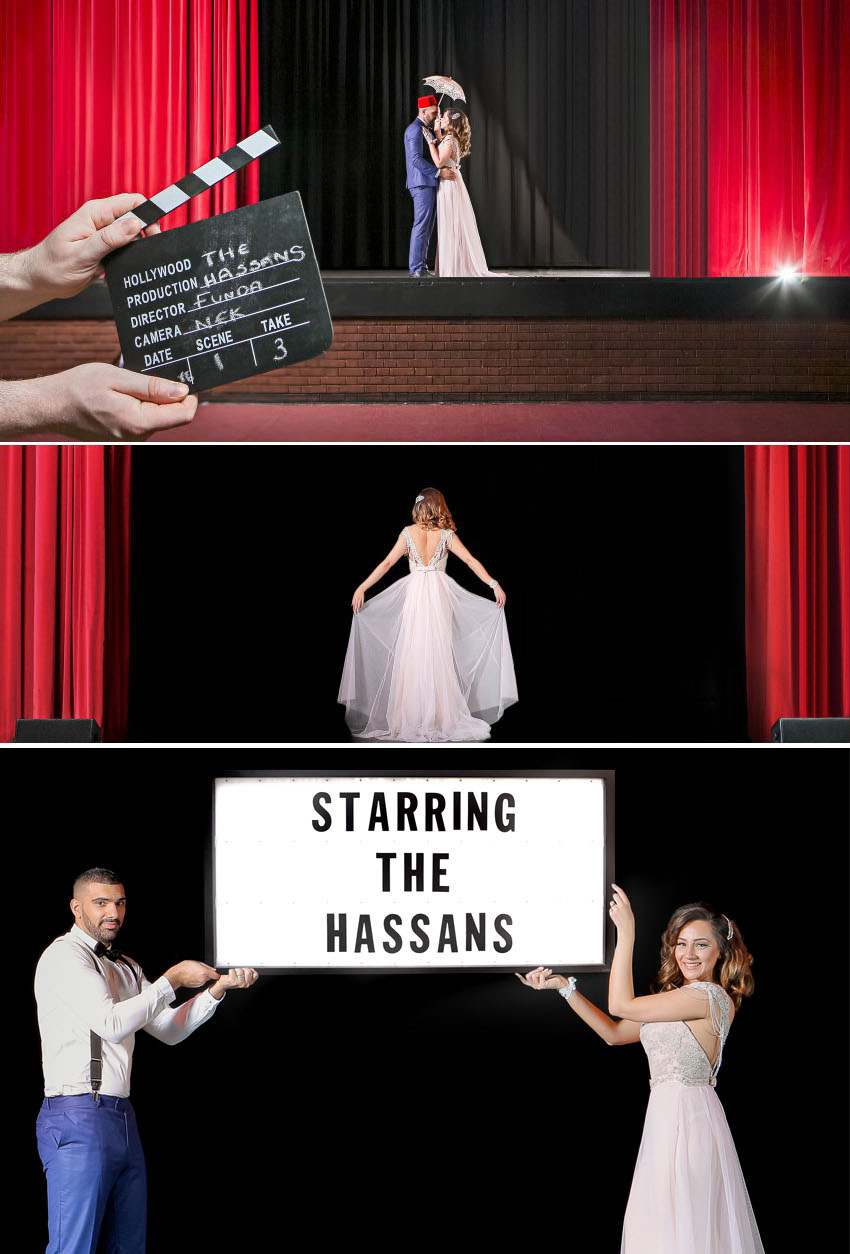 Funda was responsible for most of the props, and we worked hard to create a story rather than something that looked staged. For example, the shot of her in the dressing room features a personalised “Hollywood Walk of Fame” star. The clapperboard was another clever film prop, as was the sign with “The Hassans” – because you should certainly feel like a star in your own shoot! I also loved the Star Wars sword-fight scene, while the giant heart with traditional bulb lights really stood out on the dark stage.