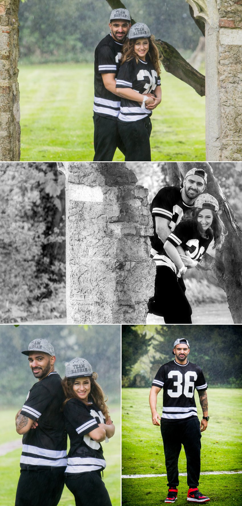 As well as dark, theatrically lit photos, we also wanted to show off the couple’s fresh, energetic side, and outdoors was the ideal setting. Again, this fun-loving couple showed how in sync they were in their choice of matching outfits and mirroring poses. The sports-inspired tops and custom-made “Team Hassan” caps encouraged the couple to relax and mess around a little..