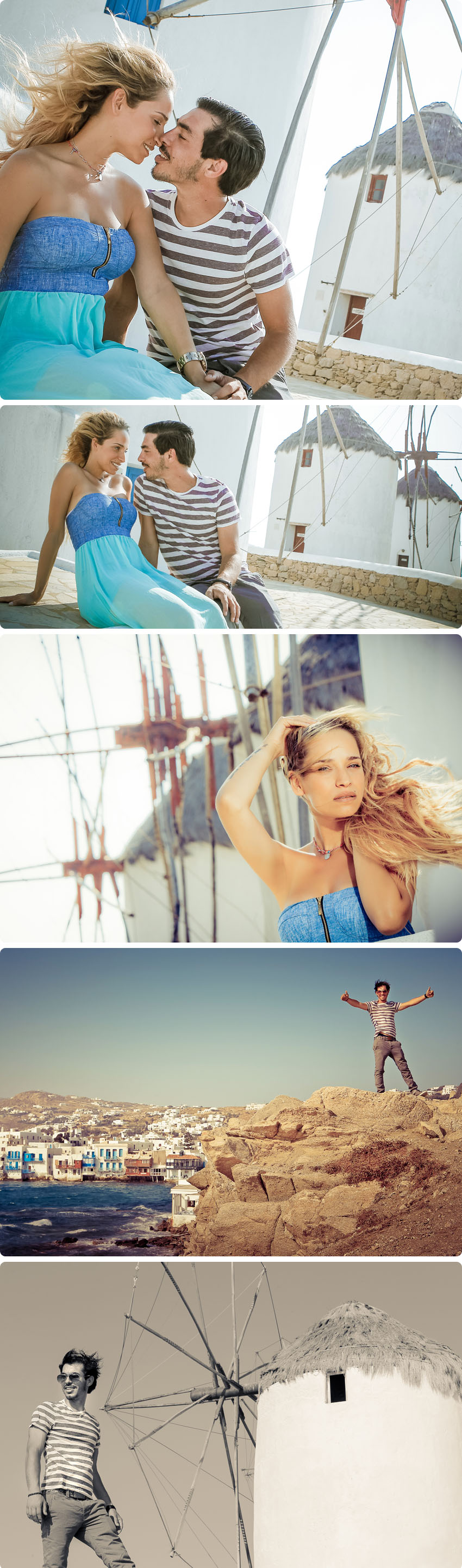 With the help of a beautiful sun, Manousos and Hara had managed to tell their own story both together as one and each on their own – and its speaks for itself! Capturing the true aura of the couple, as well as the magnificent island scenery surrounding them, it’s hard not to fall in love with this island. It’s authentic Greek blue and white architecture and distinct Cycladic island layout, crystal clear water, peerless beaches, narrow graphic alleys, picturesque windmills, and unique fun venues not found anywhere else, all synthesise an imperceptible atmosphere that is hard to resist. Especially for young couples like Hara and Manousos, who have the bursting energy of youth and flaming romance within their spirits.