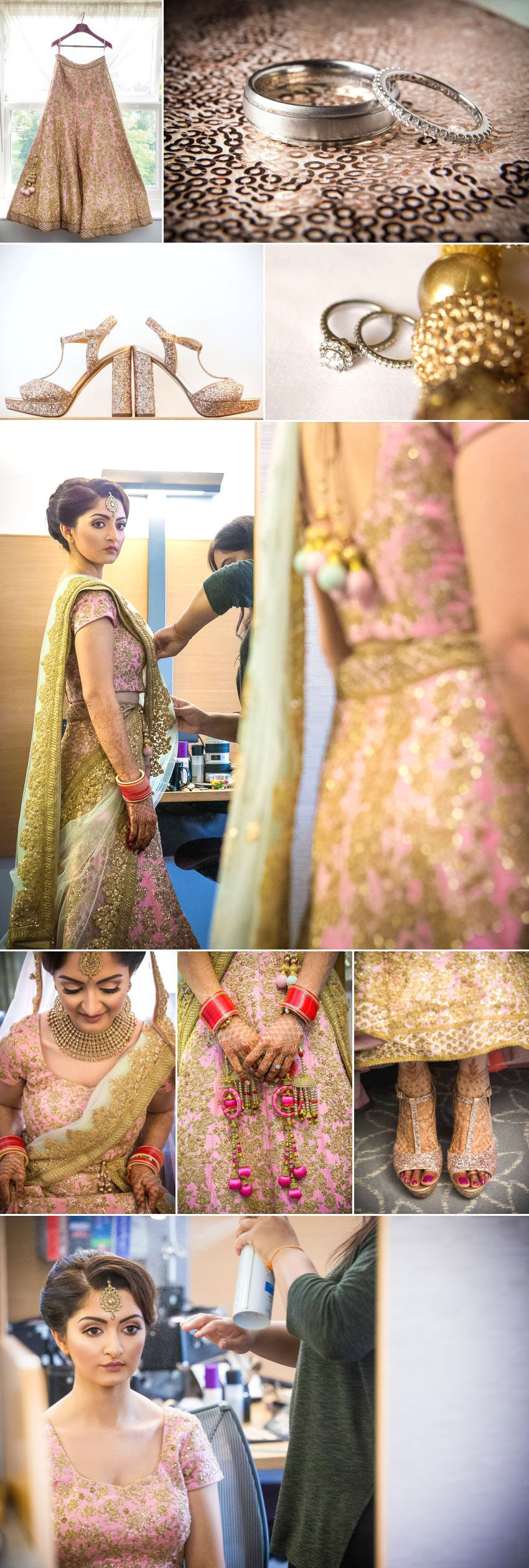 In her beautiful blush and gold brocade lehenga choli, Chandni was a stunning bride. Red is an auspicious colour in the Hindu culture, and Chandni incorporated it by wearing thick stacks of red and gold wedding bangles on each wrist. Traditionally, Hindu brides follow 16 steps of beautification to prepare themselves for their wedding and Chandni incorporated many of them into her outfit. Not only did she wear bangles, but she also included the maang tikka forehead decoration and intricately applied mehndi decorations on her hands and feet.