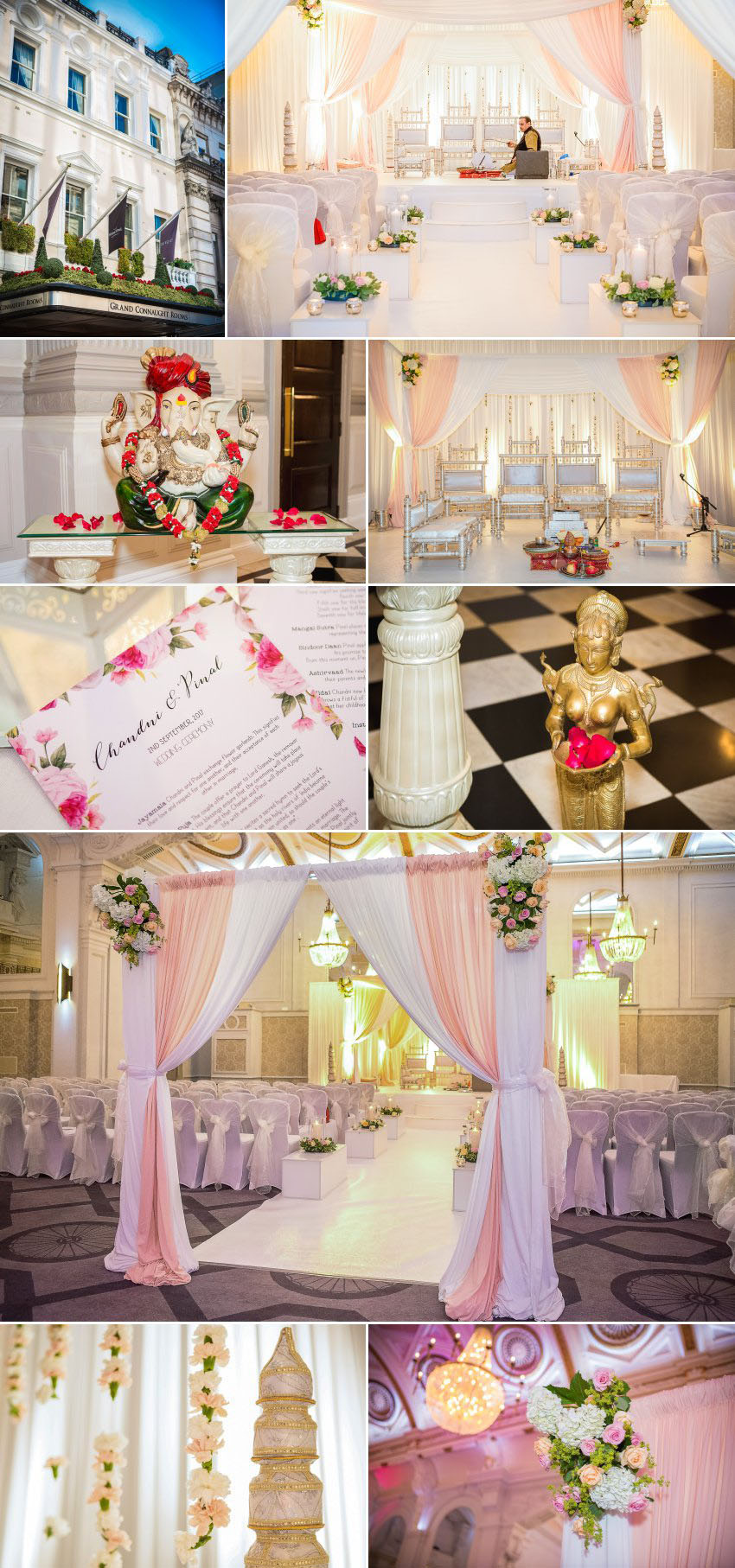 The venue, the Grand Connaught Rooms in Holborn, is perfect for a Hindu wedding. The staff are used to holding lavish celebrations, and no detail was overlooked in their quest for perfection. The hotel dates back to 1775 and is Grade II listed thanks to its period features that include ornate wood panelling and glittering crystal chandeliers. With space for up to 750 guests in the Grand Hall, it is easily large enough to accommodate an Asian wedding in central London.