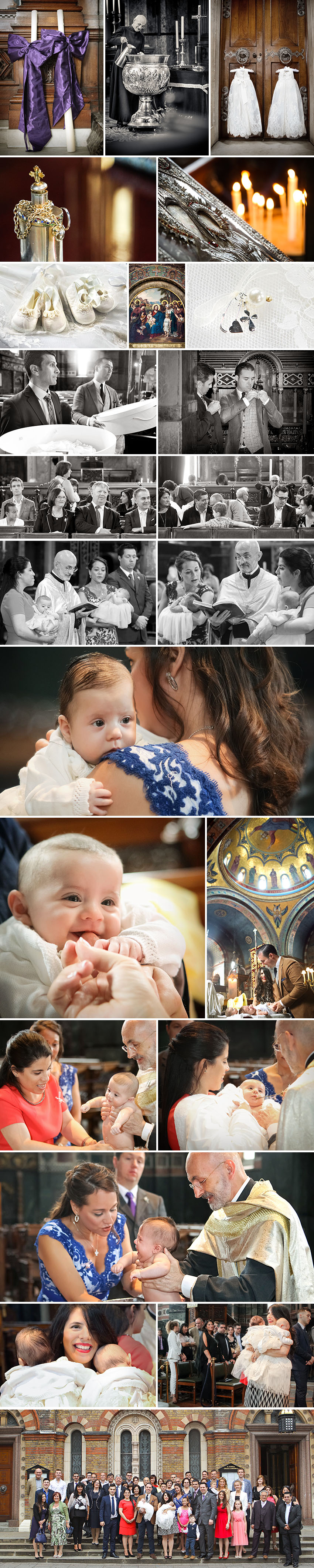 After the service parents, Godparents, and guests gathered for a group shot on the steps of the church before making their way to St Sophia’s Cathedral in Bayswater for the Greek Orthodox ceremony. I always feel lucky doing my job, but having the opportunity to work in not one of London’s most beautiful churches, but two in one day, was definitely an opportunity I was grateful to receive. As with the Roman Catholic service, the Greek Orthodox christening was sincere and moving. The families may worship in different churches but it is clear their faith is strong, and they were united in their determination Emilia and Anabella should have the best start in life.