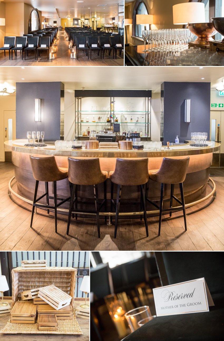 Banking Hall is a fantastic central London wedding venue not only because of its location but also because of its beautiful architectural details. The art deco building is Grade II listed and offered a wealth of fantastic backdrops for wedding shots. The couple held their civil ceremony in the Counting Room, which is a wonderful space with incredible views of the city and lots of natural light. The decor in here could be considered masculine, with the black and tan leather chairs, art-deco angles and hard surfaces, but the flickering candles in tall glass tubes that lined the aisle softened the effect with a romantic touch.
