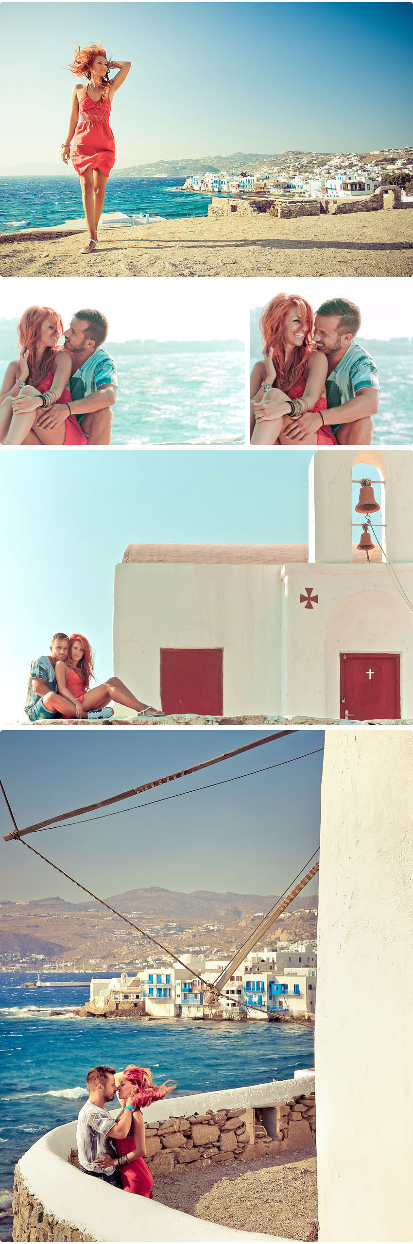 Mykonos was the ideal place for Billy and Tery’s session. We started at Chora’s windmills, which are one of the island’s most recognised sights. Our timing was perfect and we were able to enjoy the backdrop as well as the view across Little Venice virtually to ourselves. It was breezy up there and the movement of the waves (and Tery’s hair!) added extra vibrancy to the images.