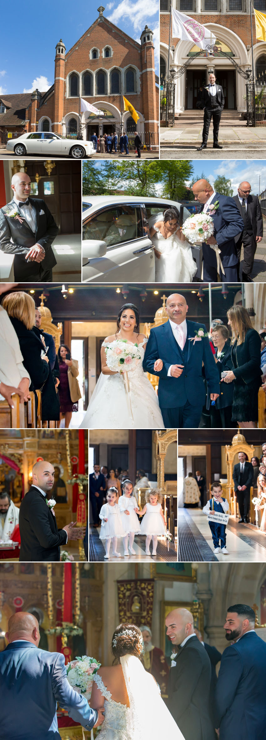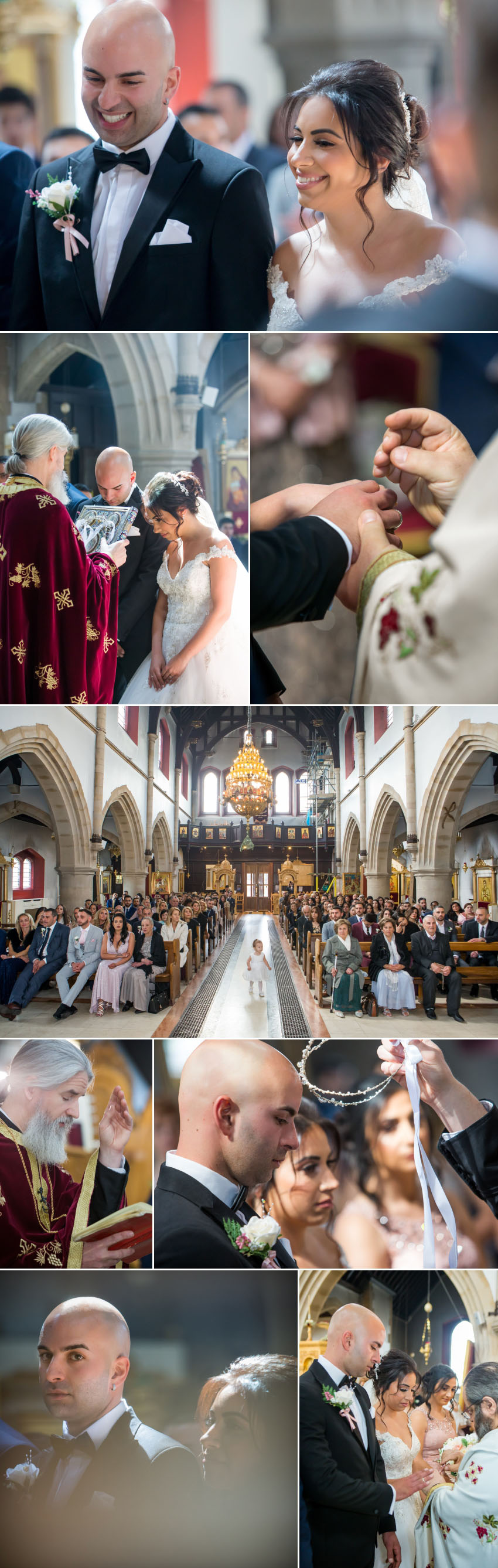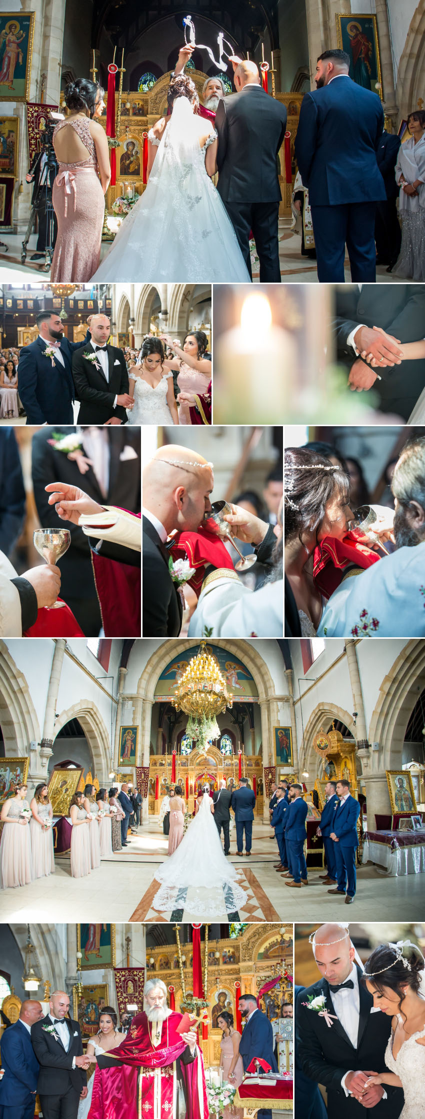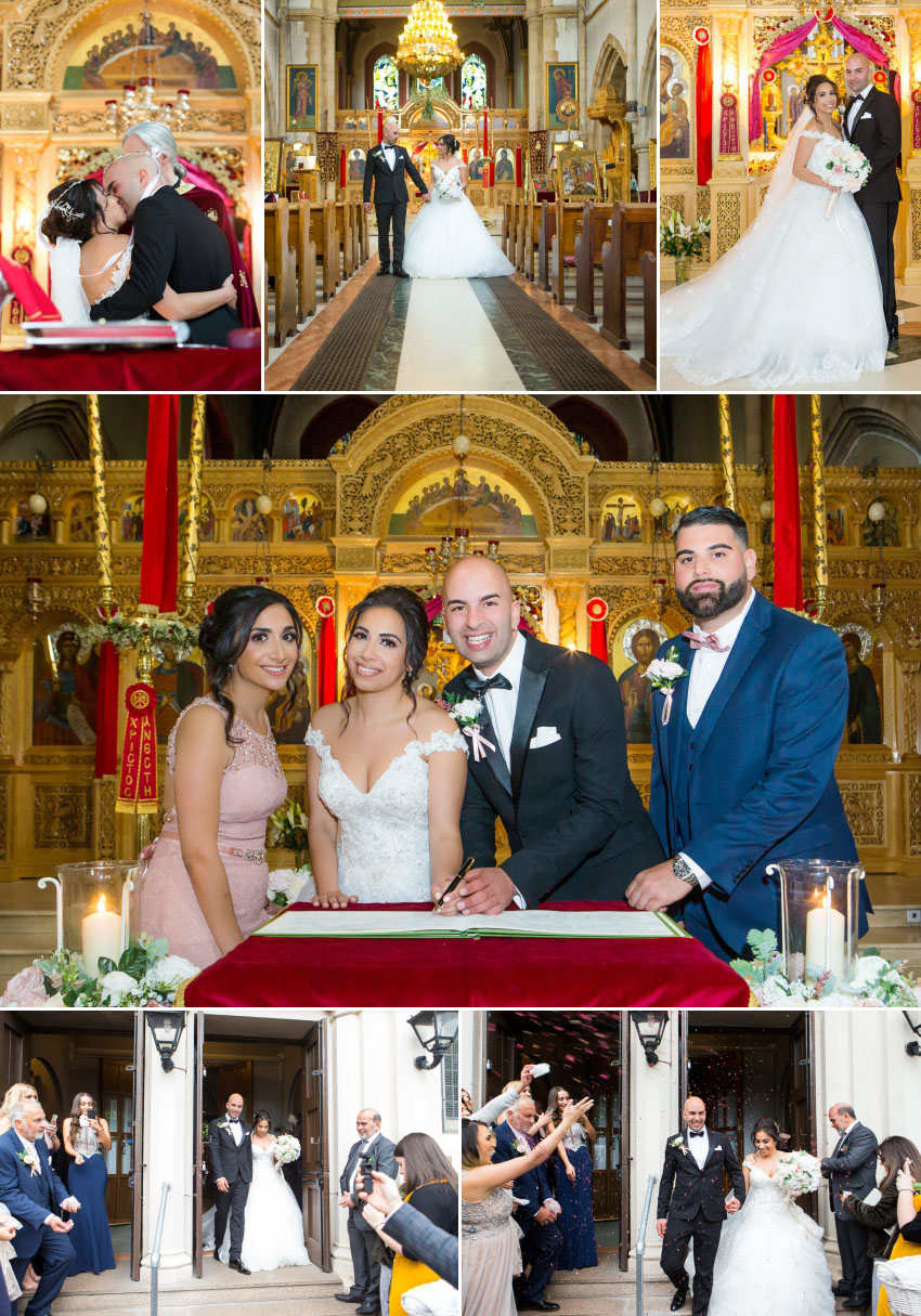 The weather was perfect for Christalla and Chris’ wedding at Orsett Hall, so Chris sat outside in the sunshine while his koumbaro performed the traditional wedding-day shave. At the end of his preparations, the groom looked as smooth as James Bond in his black dinner jacket, flanked by his groomsmen as they made their way to the church. While one team was busy at Chris’ house, another was at Christalla’s, capturing her preparations which included the stolisma that is Greek-Cypriot customary. It wasn’t immediately apparent on the day but, looking back at the images during editing, it is surprising how similar the three beautiful sisters look!