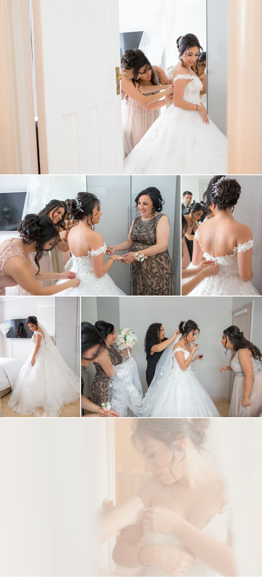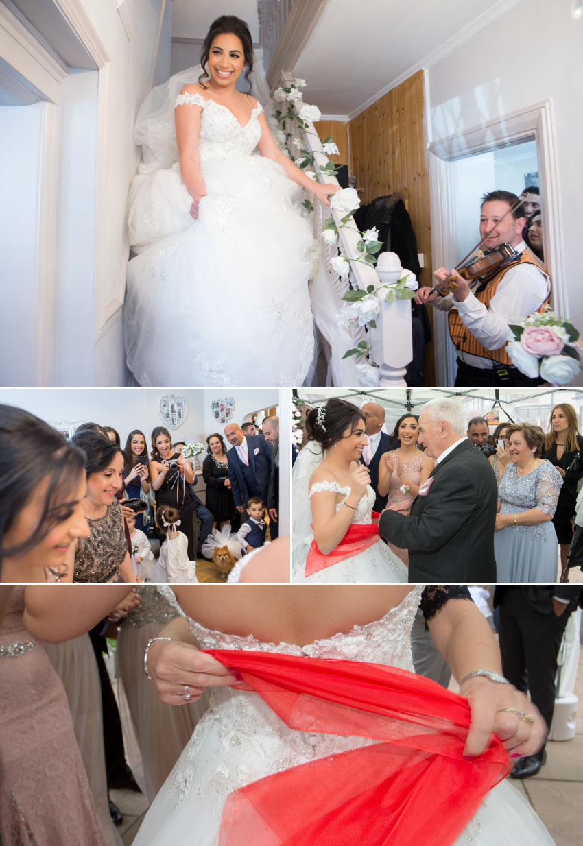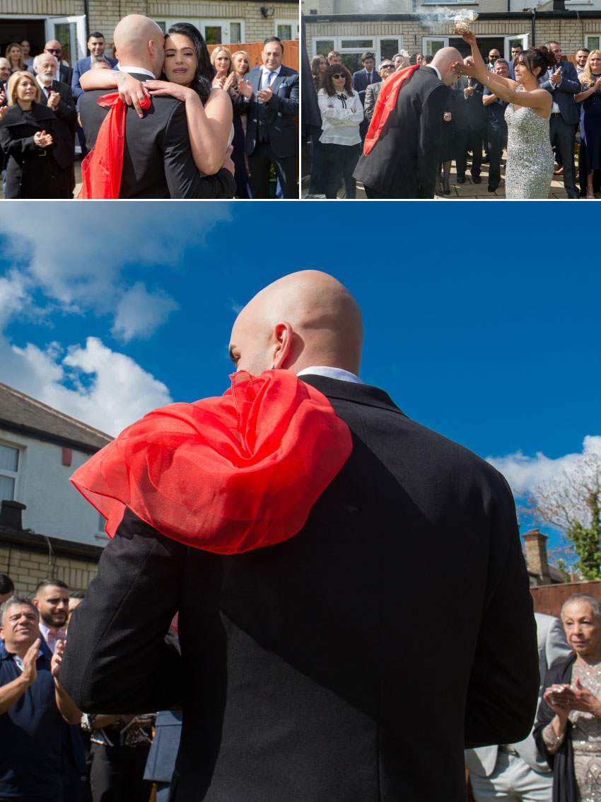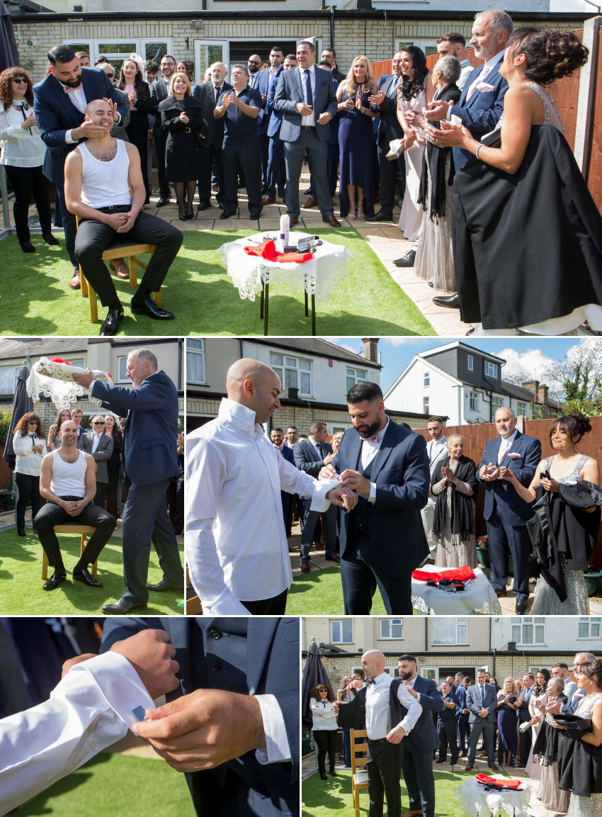 The weather was perfect for Christalla and Chris’ wedding at Orsett Hall, so Chris sat outside in the sunshine while his koumbaro performed the traditional wedding-day shave. At the end of his preparations, the groom looked as smooth as James Bond in his black dinner jacket, flanked by his groomsmen as they made their way to the church. While one team was busy at Chris’ house, another was at Christalla’s, capturing her preparations which included the stolisma that is Greek-Cypriot customary. It wasn’t immediately apparent on the day but, looking back at the images during editing, it is surprising how similar the three beautiful sisters look!