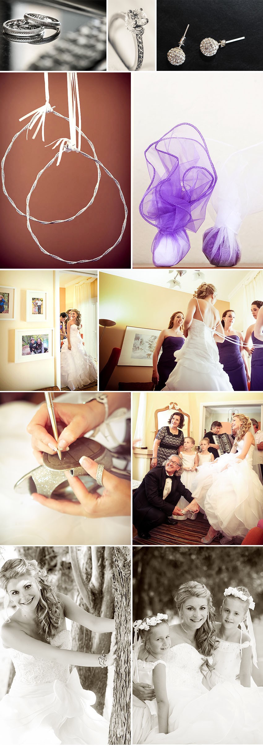She was a classically beautiful bride in her strapless sweetheart wedding gown with a fabulously full ruffled skirt. The pure white dress was offset sensationally by her bridesmaids, whom she had chosen vivid purple strapless dresses for, and her matron of honour, who wore hot pink. The gardens were full of purple and white flowers, and we had a lot of fun taking shots before the bride, her family, and friends made their way to the church on foot, accompanied by musicians and merriment.